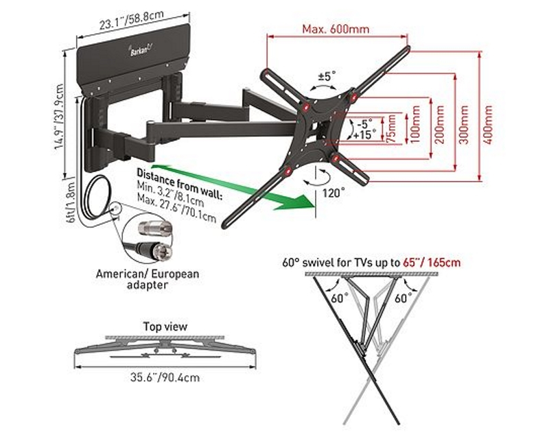 Uglovi pomeranja - Tilt -5 stepeni +15 stepeni, Fold ± 360 stepeni, Swivel 60 stepeni
